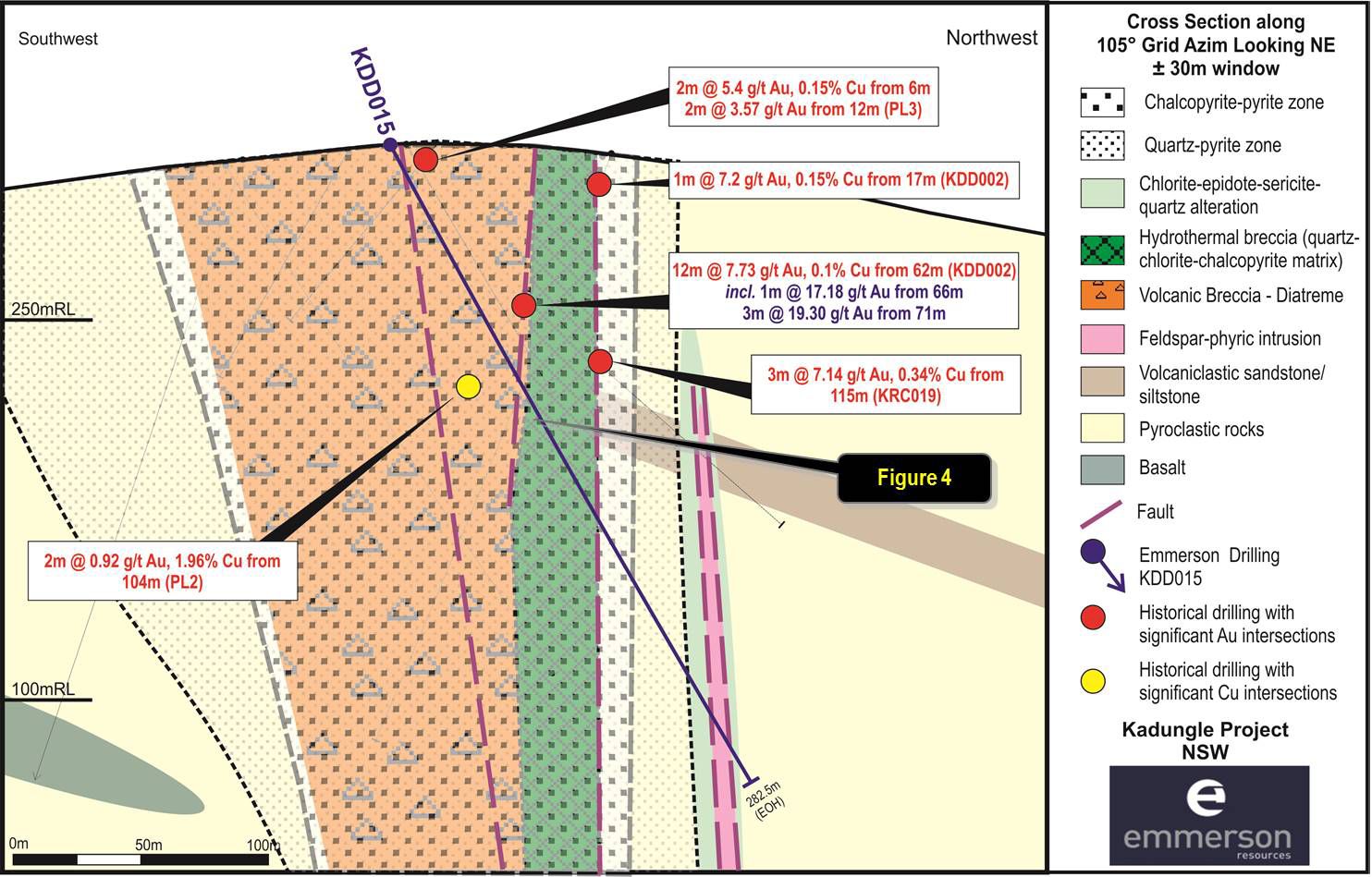 EMMRF:OTCMKTS) is pleased to announce that our first drill hole at Kadungle in NSW (see Figure 1 in the link below) has intersected visible sulphides within an extensive zone of alteration. This drill hole supports the previous historical drilling where high-level epithermal veins were intersected with best assays of 12m at 7.73 g/t (KDD002) and 3m at 7.14 g/t Au (KRC019) (see Figures 2 and 3 in the link below). Similarly, deeper disseminated and veined copper-gold produced intersections of 37m at 0.23% copper including 6m at 1.1% copper (KDD013) and 154m at 0.12% copper and 0.37g/t gold (KRC019) (ASX. 04 October 2016).