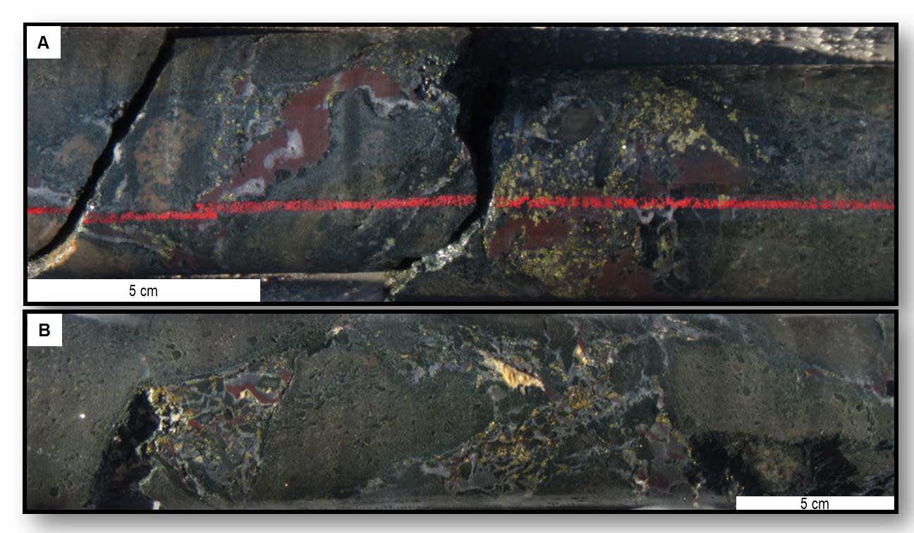 o Intermittent quartz-chalcopyrite-pyrite and hematite veins and breccia with disseminated chalcopyrite (112 to 150m).