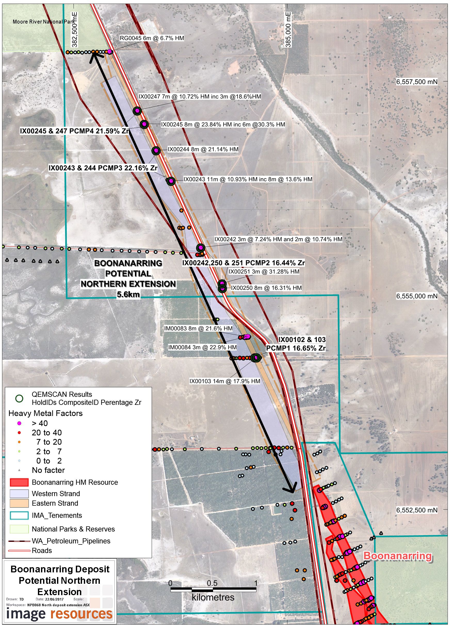 The Boonanarring deposit is located 80km north of Perth and is 100%-owned by Image. The deposit is arguably the highest HM grade, high-zircon undeveloped mineral sand deposit in Australia and is the subject of recently announced strong bankable feasibility study results (ASX release 30/05/2017).