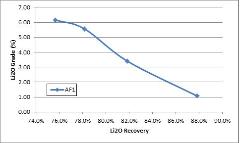 A single flotation test conducted on a spodumene sample completed at the grind size (P80 = 150 micron m), produced a high-grade concentrate of 6.16% Li2O at a relatively high recovery rate 75.7%.