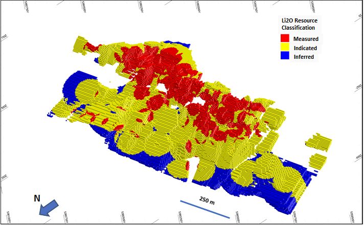 The Measured Mineral Resource was defined within areas of close spaced diamond drilling of less than 35 metres by 35 metres, and where the continuity and predictability of the spodumene bearing pegmatite was high. The Indicated Mineral Resource was assigned to areas where drill hole spacing was less than 60 metres by 60 metres. The Inferred Mineral Resource was assigned to areas where drill hole spacing was greater than 60 metres by 60 metres generally in the edges of the known mineralisation mostly in the down-dip extensions beyond the last drill holes in each section.