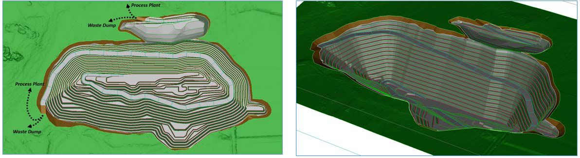 The design outlines a pit of ~1,000 metres in length (east-west), an average of 600 metres width (north-south) and down to a final pit depth of 200 metres. The maximum planned total material movement including waste, stockpile reclaim, and ore to the run-of-mine ("ROM") pad is 9.5 Mtpa.