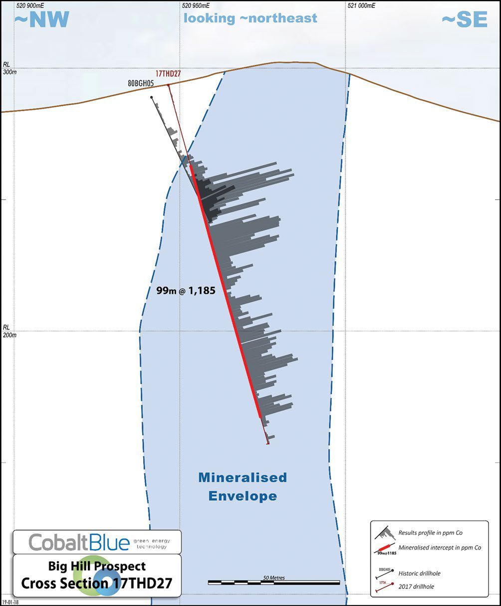 o 17THD027 - 99m at 1,185ppm Co, 10.7% S & 10.0% Fe from 32m