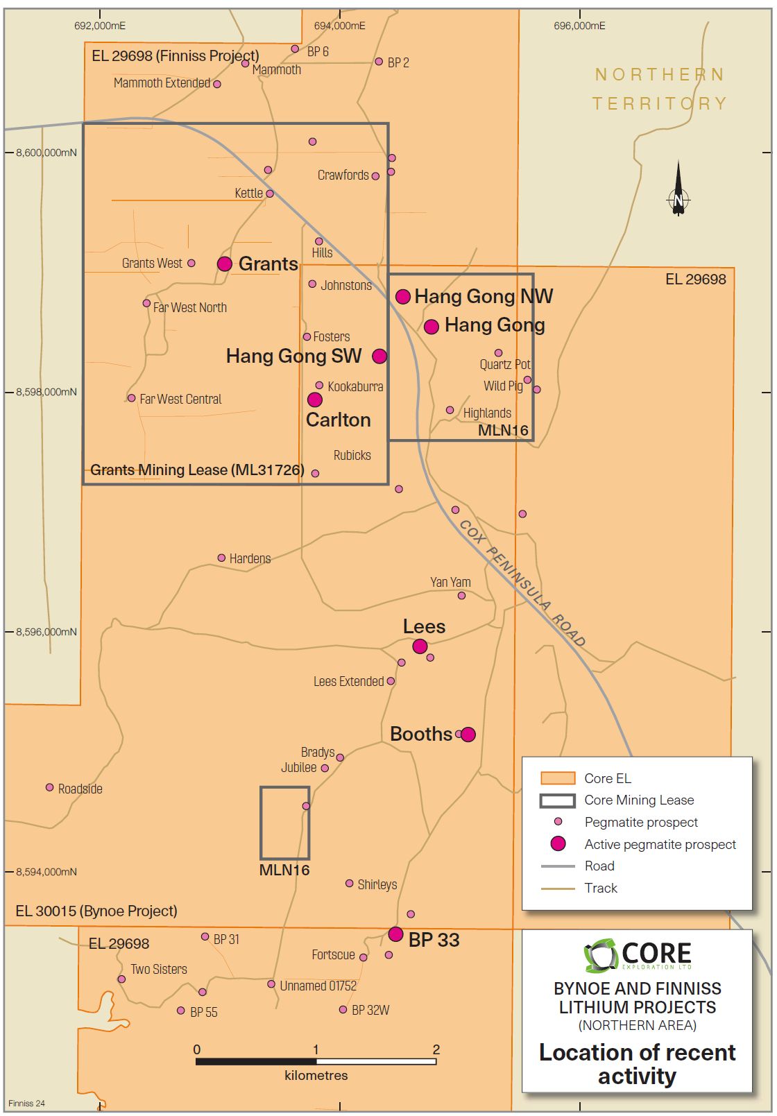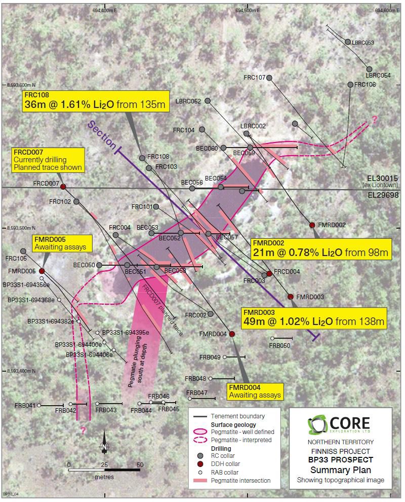 ASX:CXO) ("Core" or the "Company") is pleased to announce that new wide and high-grade lithium intersections have identified substantial strike and depth extension potential at Core's 100% owned BP33 pegmatite within its Finniss Lithium Project.