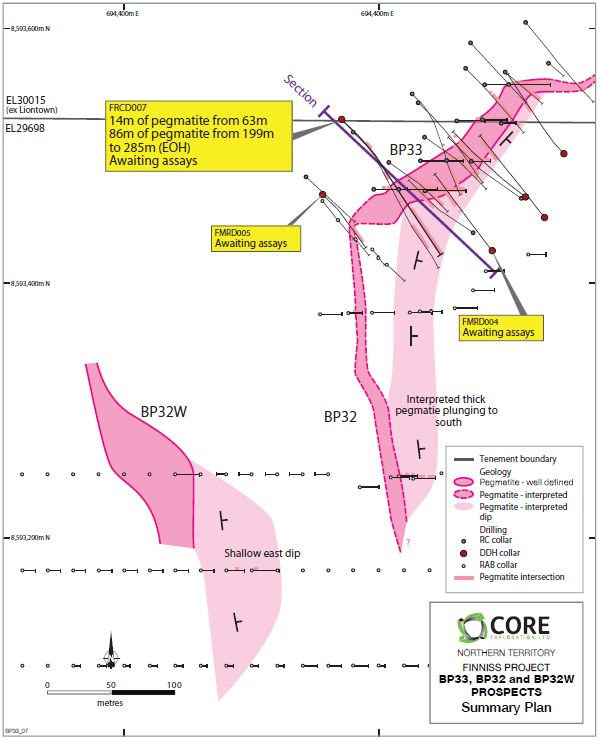 ASX:CXO) ("Core" or the "Company") is pleased to announce that an 86m continuous intersection comprising spodumene pegmatite has been drilled at the BP33 Prospect within Core's 100%-owned Finniss Lithium Project near Darwin in the NT.