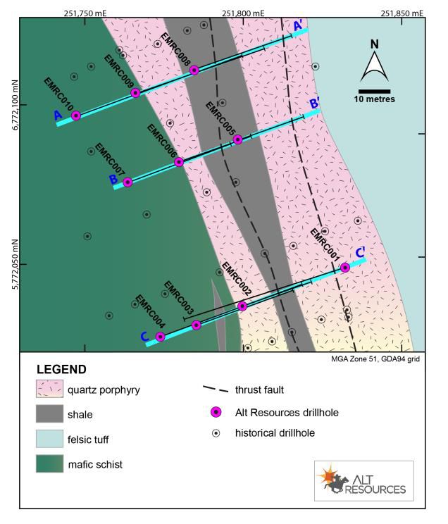 Figure 2 (see link below) shows the location of new drillholes discussed in this release, with newly interpreted geology based on Alt's recent activities and drilling. Relevant sections are given in Figure 2 and 3 (see link below), showing the broad intercepts through the mineralised zone and a strong association between mineralisation and a distinctive black shale unit (also noted by historical explorers) within the host quartz porphyry.