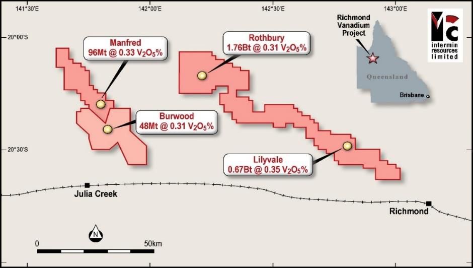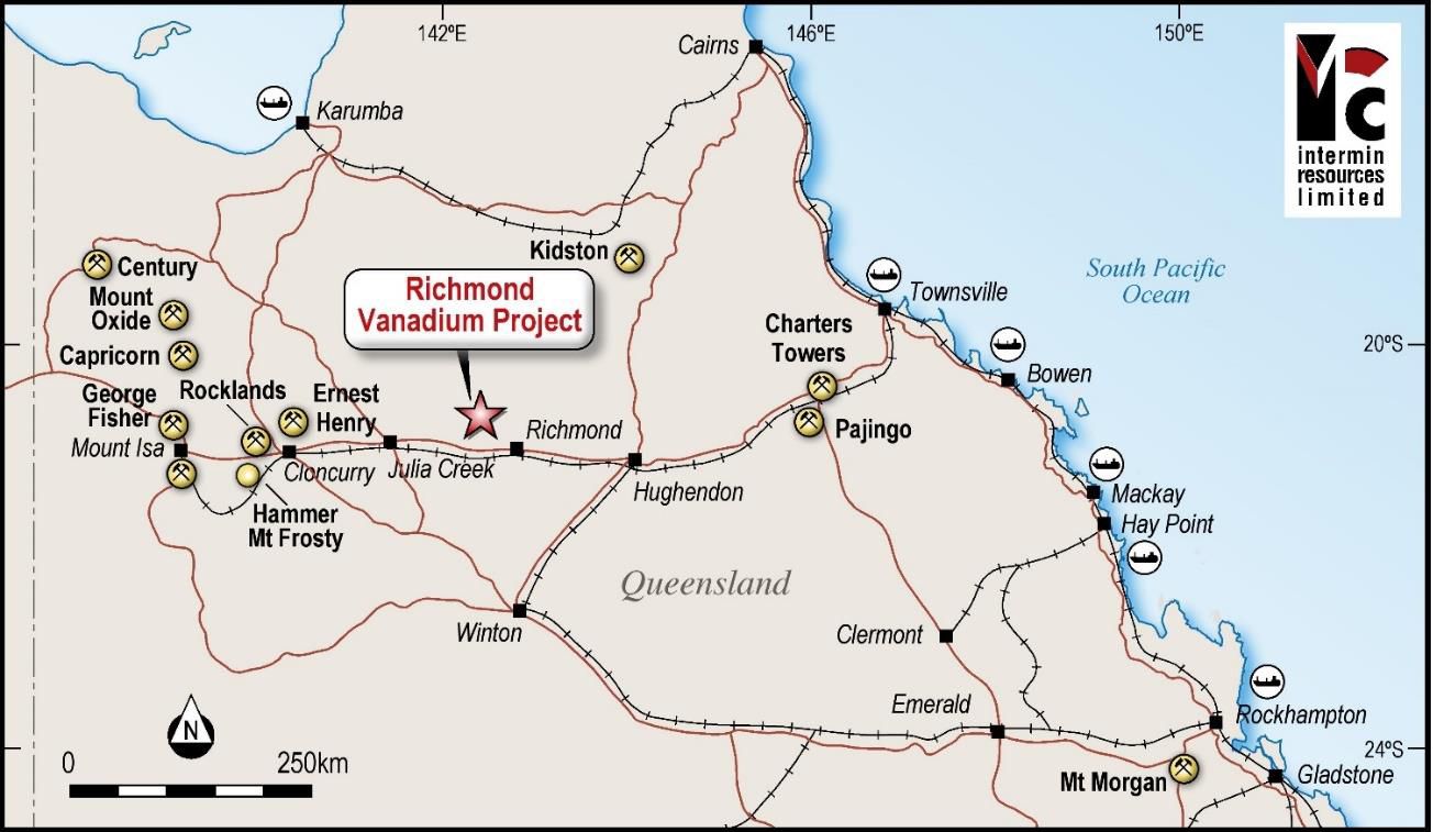 Intermin owns 100% in five Mineral Exploration Permits (EPM25163, EPM25164, EPM25258, EPM26425 and EPM26426) covering 481 Blocks near Richmond and 100% of the metal rights to Global Oil Shale Plc's Julia Creek (Burwood) MDL 522 (see Figure 3 in link below). The current Mineral Resource for Richmond is 2,579Mt grading 0.32% V2O5 at a 0.29% cut-off grade (see Note 3 below).