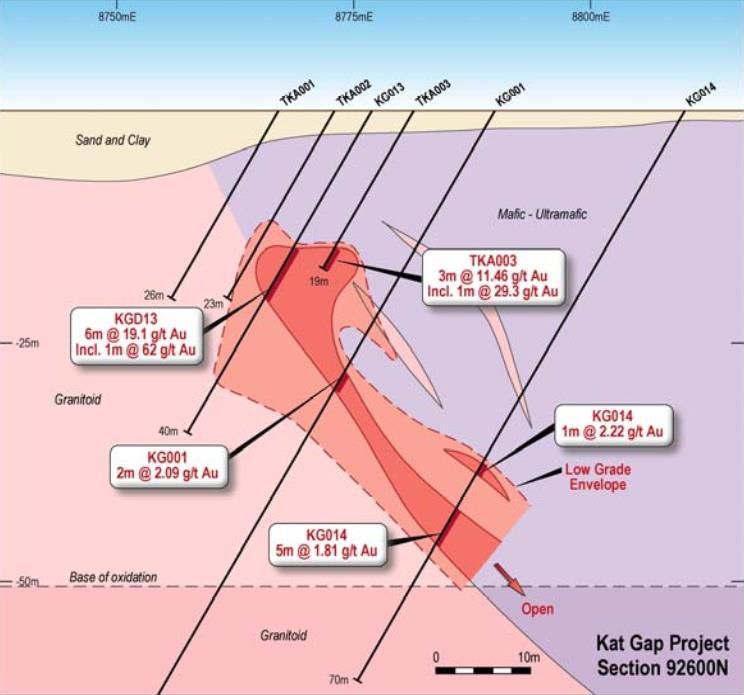 RAB coverage has not always been effective. In a report dated 2003, SOG noted that "...Much of the RAB drilling at Kat Gap was ineffective, failing to penetrate far enough into the bedrock to properly test the granite-greenstone contact....There remains good potential for further gold mineralisation on the more than 4km of strike of the granite-greenstone contact."