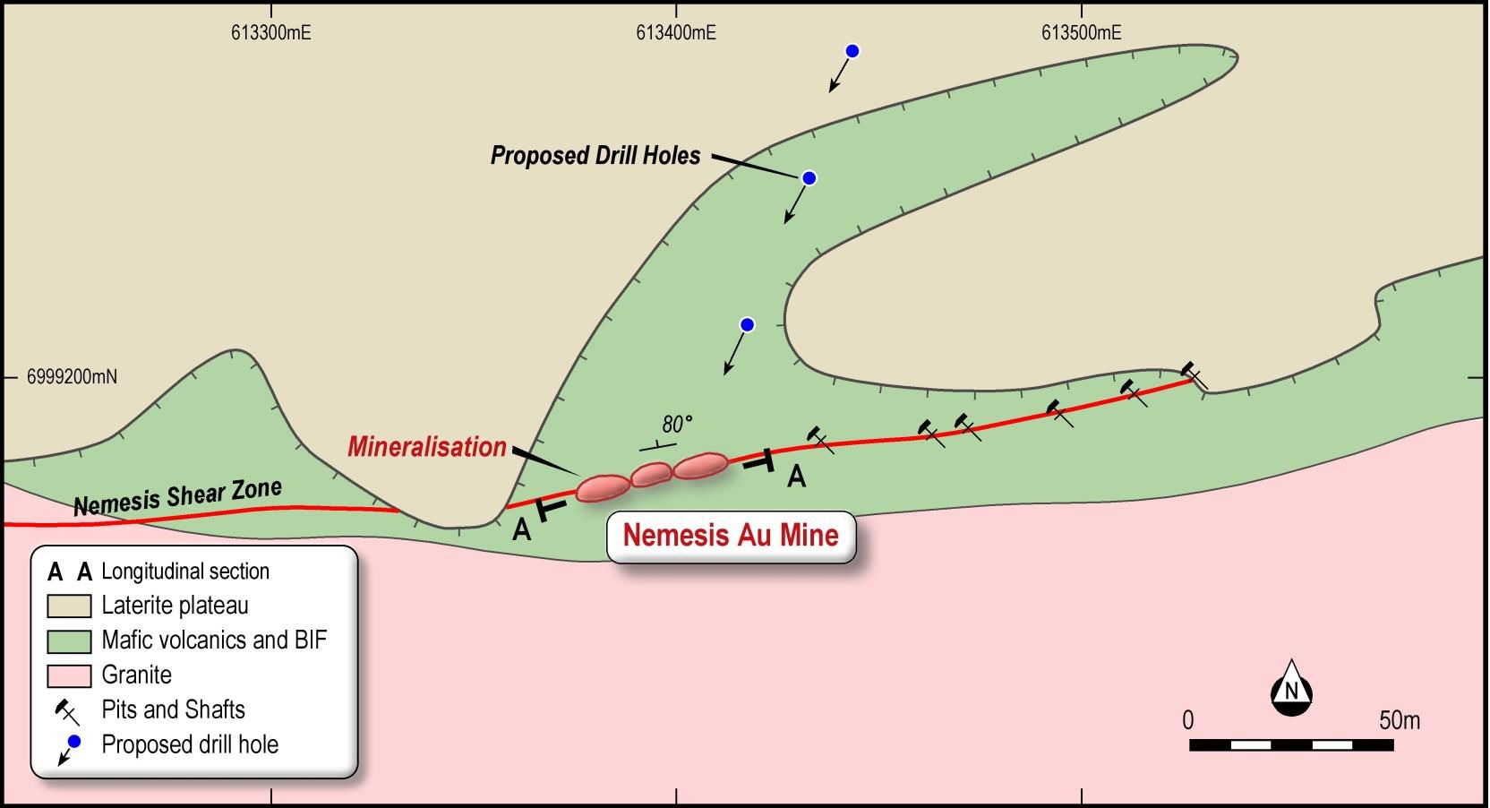 The Nemesis shear zone is an east-west trending mineralised shear zone that forms the contact between the north sequence of mafic volcanics/BIF's and granites to the south. The shear zone occurs close to the scarp of the lateritic plateau.