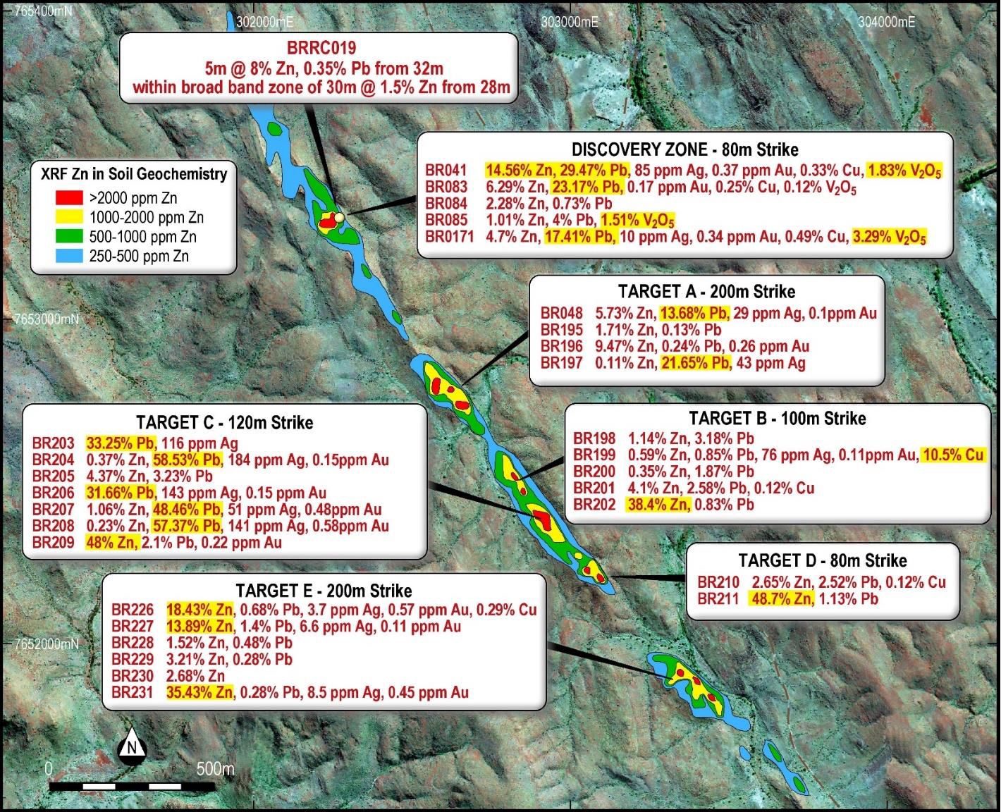 High-grade base metal assays were confirmed from rock chip samples taken from all five potential Zn breccia pipes defined previously (announcement 5th June 2018). Additional to the discovery zone (single RC drill-hole BRRC019 returned 5m @ 8% Zn, 0.35% Pb from 32m), targets A to E (potential Zn breccia pipes) returned exceptionally high-grade Zn and/or Pb values in grab sampling over previously defined very high-grade Zn in soil geochemistry (pXRF). Results include: