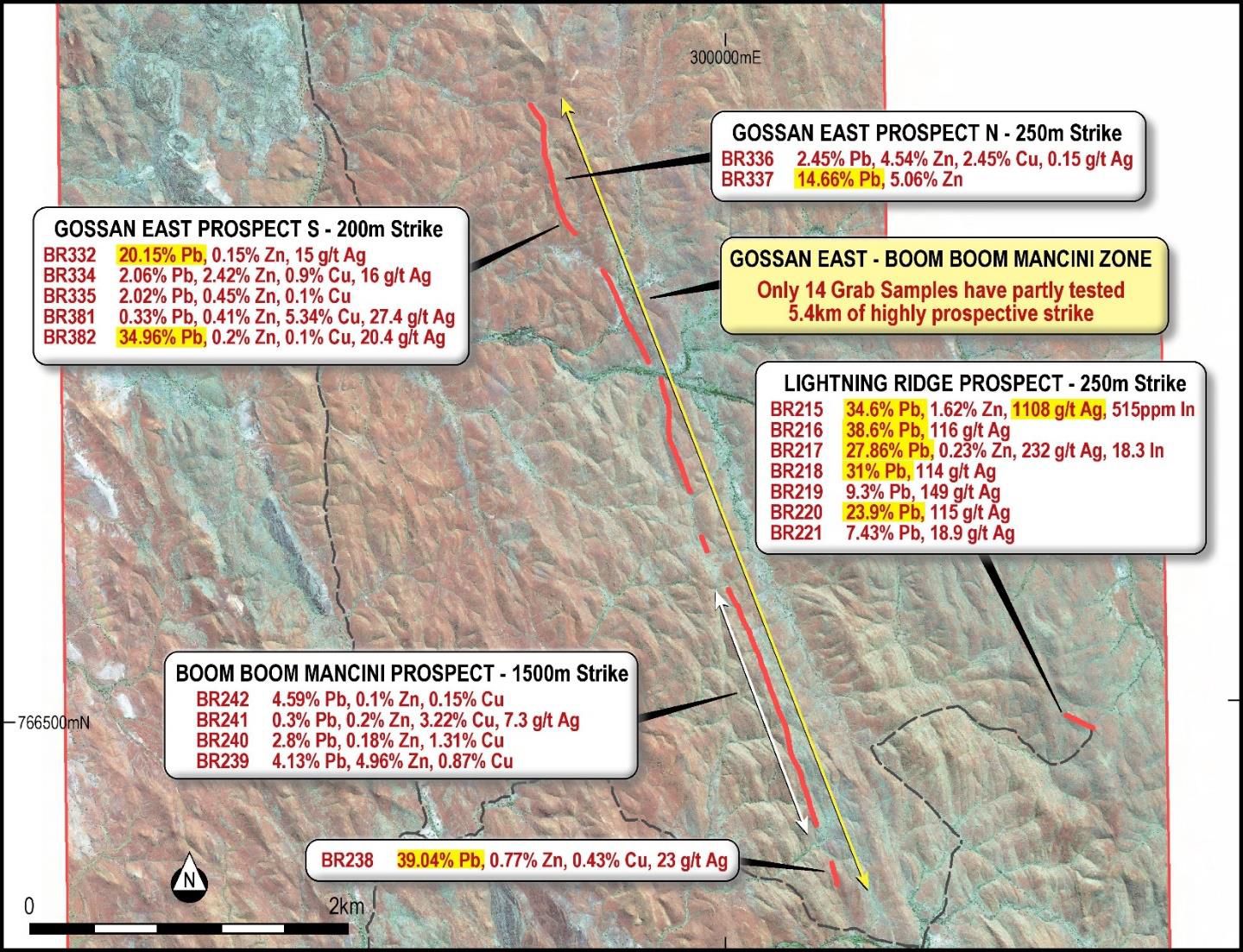 - The Gossan East - Boom Boom Mancini mineralised trend extends over a strike of 5.4km. Results from virgin outcrop (no historical workings) includes: