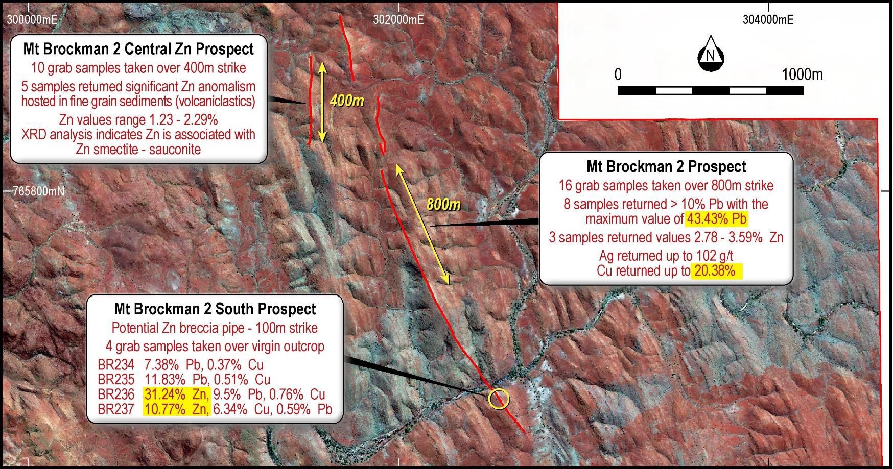 Three zones of high-grade base metal mineralisation focused in the Mt Brockman 2 area have been confirmed by grab sampling (multi-element analysis).
