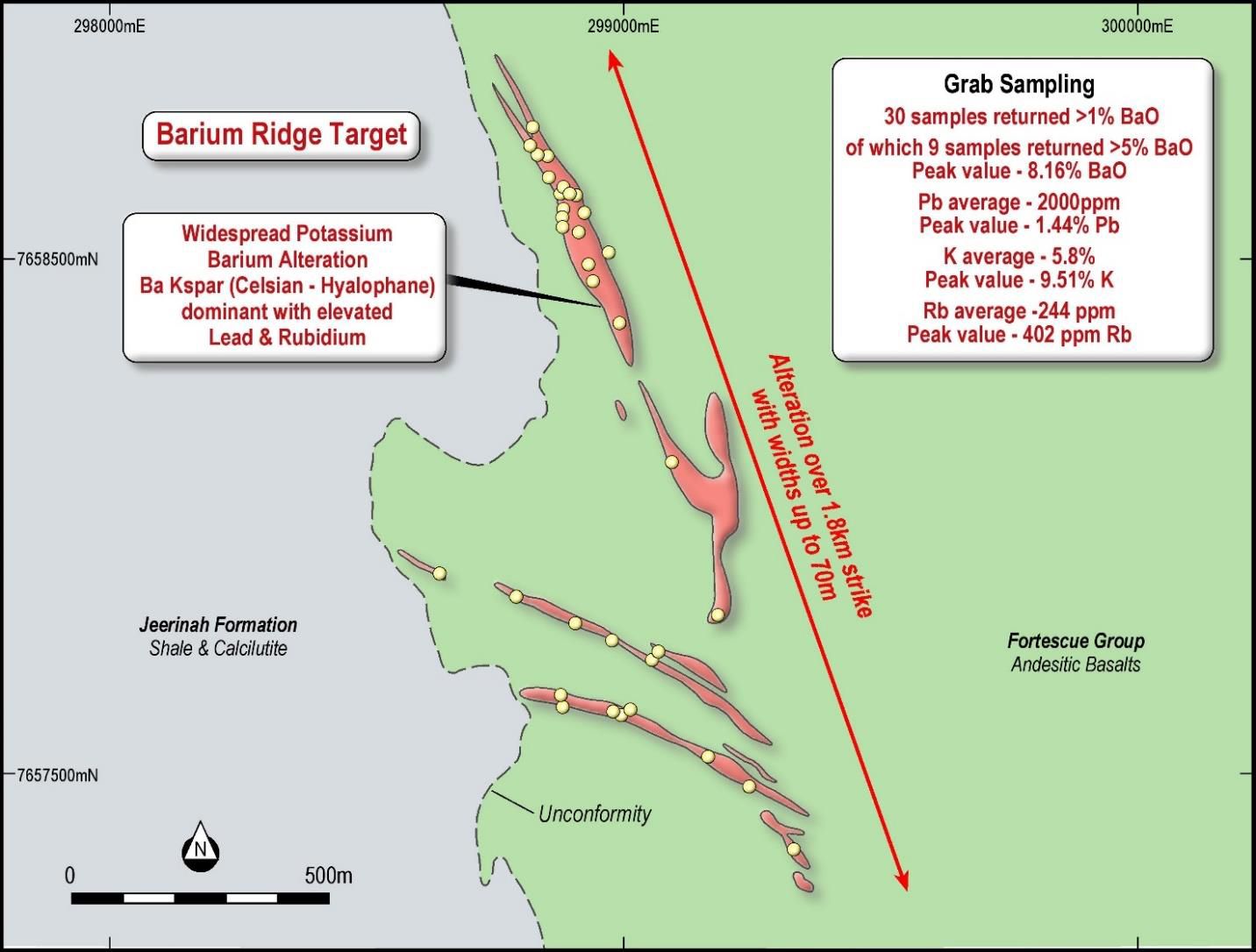Multi-element analysis of the grab samples confirmed all 30 rock chips returned >1% BaO, with 9 samples returning >5% BaO. The peak value is 8.16% BaO. Potassium was high (average 5.8%) with a peak value of 9.51% K.