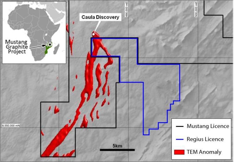 The Caula discovery is located at the northern end of a suite of large-scale geophysical (TEM) anomalies that extend over an 18km strike length within Mustang's tenements (see Figure 5 in link below). Drilling at the Caula site confirms a strong spatial correlation between the TEM anomaly and high grade graphite drill hole intersections. The larger-scale TEM anomaly has received minimal drilling to date and therefore remains largely untested.