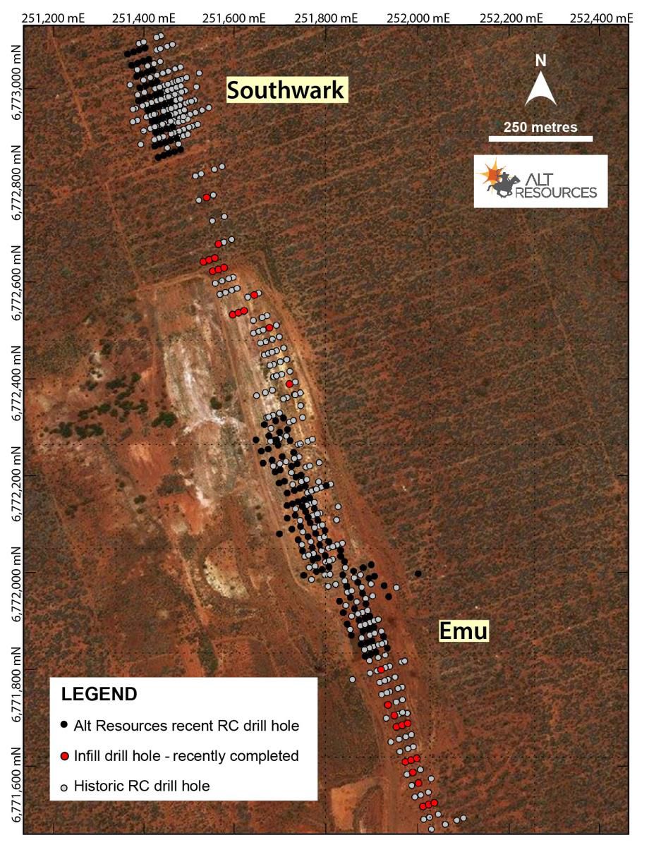 The second phase of RC drilling conluded on 31st July. Alt drilled 45 RC holes for a total of ~2,400m, including 29 holes at the Emu deposit and 16 holes at the Cascade prospect (previously XXXX). Holes were designed to validate historical drilling, test mineralisation extensions south of Emu and infill existing drill fences between Emu and Southwark (see Figure 1 in link below).