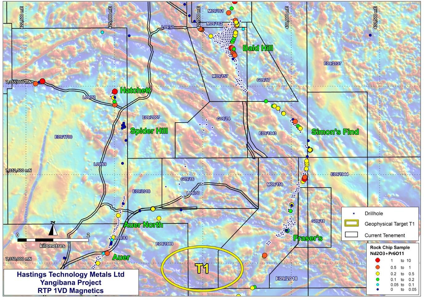 The strength of the anomaly in the Yangibana environment suggests the presence of a large magnetite-rich body, potentially similar to the magnetite-rich units that host portions of the known rare-earths deposits nearby.