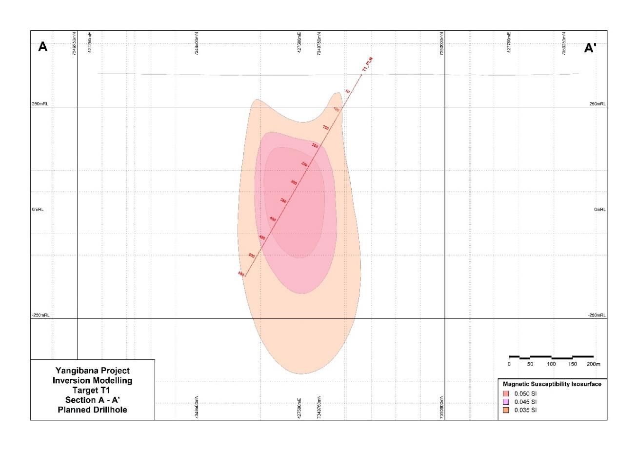 The detailed assessment of this feature has defined an anomalous magnetic feature with a strike length of approximately 1km with a strong magnetic susceptibility. The modelled feature has a depth extent of approximately 800m extending from surface, and a width of approximately 400m. This body has a higher intensity core (darker pink in Figure 3) (see link below) with a strike length of approximately 750m, a depth extent of approximately 650m (from 60m below surface), and a width of approximately 300m.