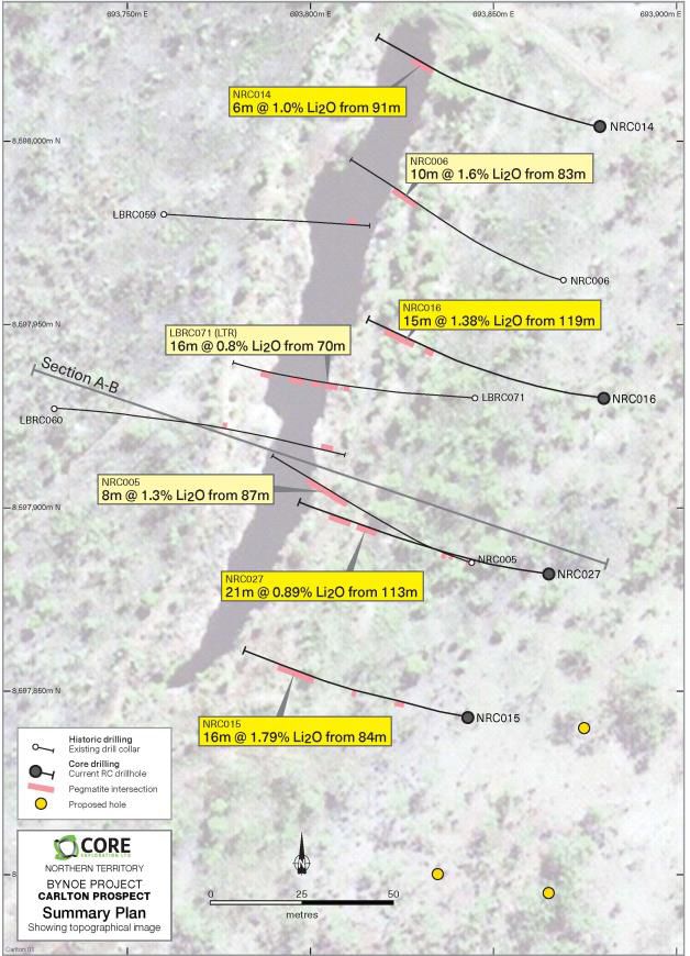 Five RC holes drilled in 2018 by Core at Carlton have consistently defined a spodumene pegmatite over a strike length of at least 200m.