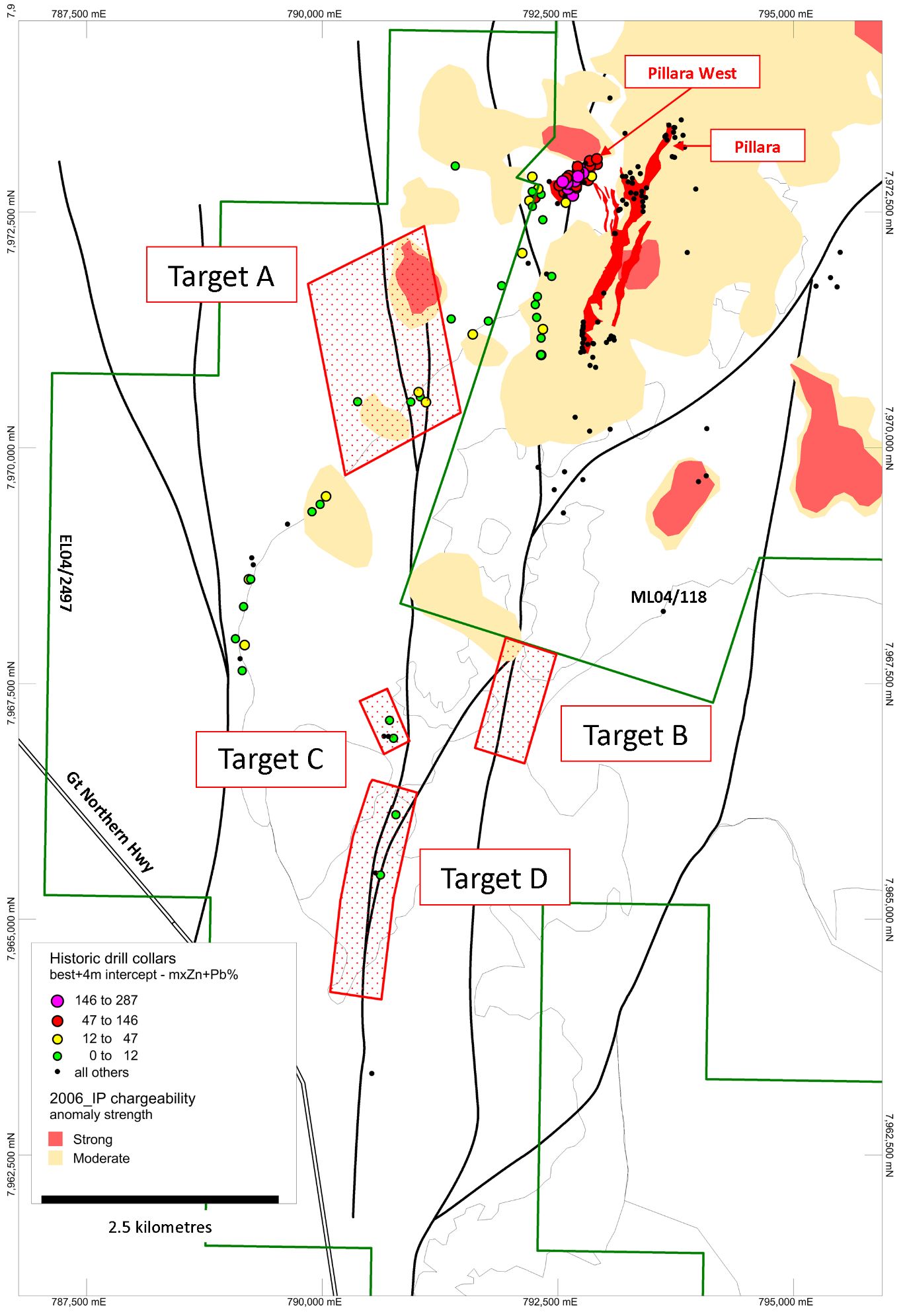 - Targeting large scale zinc + lead + silver deposits similar to the nearby Pillara deposit and along strike from known mineralisation