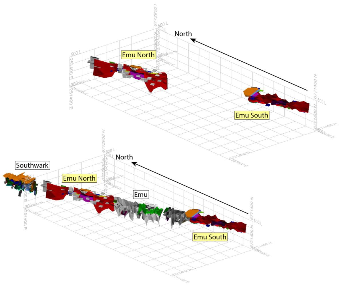 The mineralised envelope was wireframed using both geological logging information and assay data for Au (g/t). The Mineral Resource has been divided up into discrete deposits at the North and South Emu Extensions. Figure 5 (see link below) shows the interpreted wireframe model for mineralisation at the North and South Emu Extensions. The complete wireframe model for the entire deposit as drilled and modelled thus far (Southwark to Emu) is also shown.