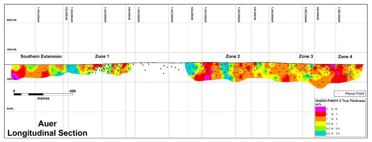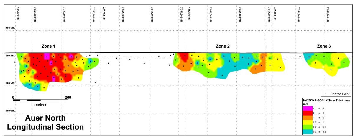 Longitudinal sections of Auer and Auer North showing accumulation (metre % Nd2O3+Pr6O11) are shown in Figures 1 and 3 showing good potential for additional resources particularly at depth along the length of Auer and at Auer North Zone 1. Figures 2 and 4 show the resource categorisation for the two deposits.