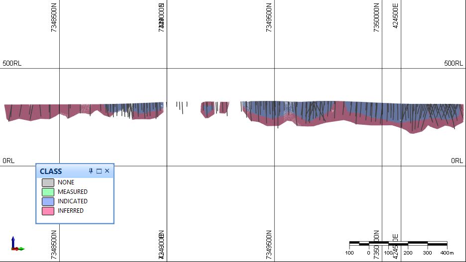 - Drill spacing 100m by 50m to 100m by 100m - Inferred