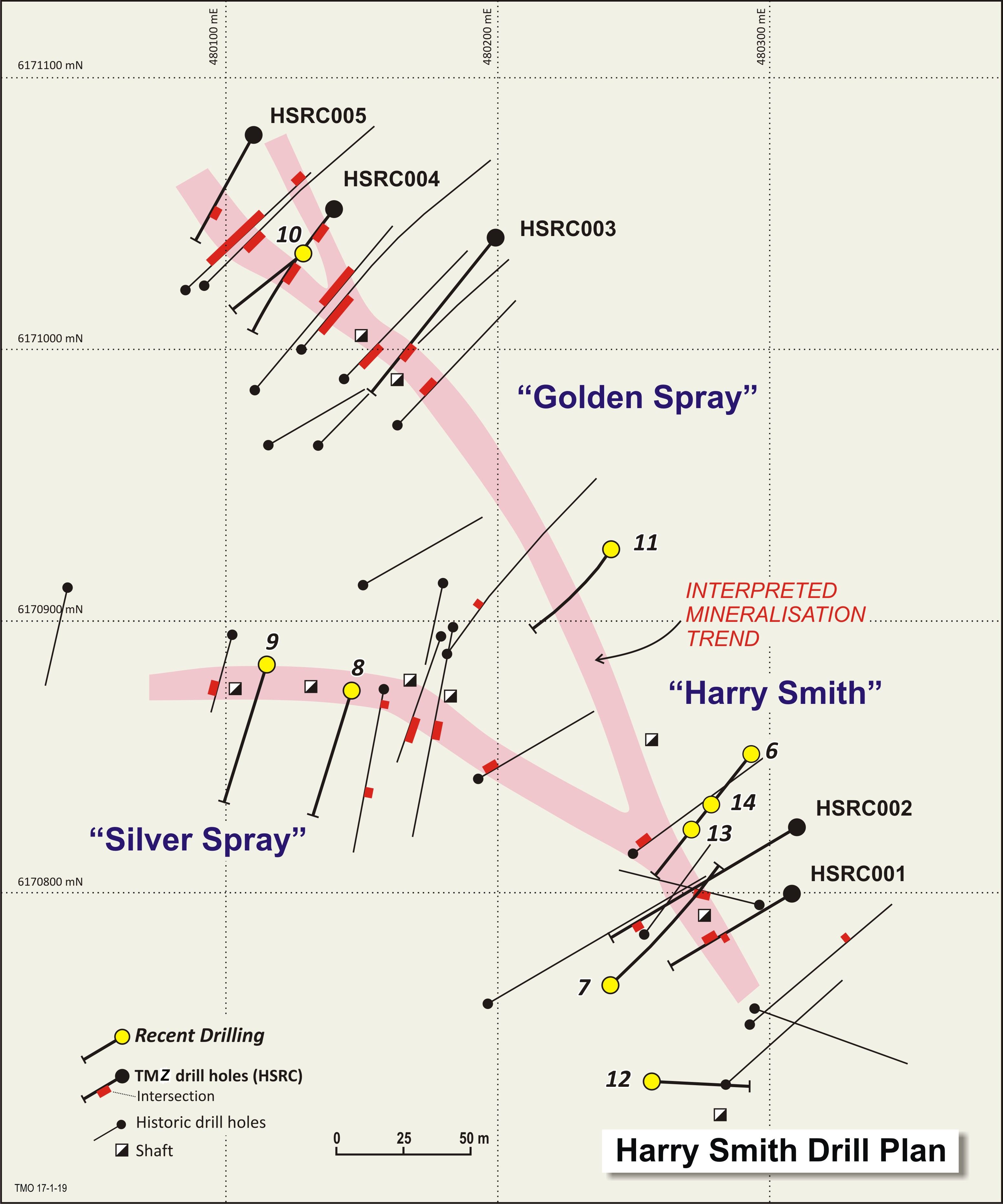 ASX:TMZ) is pleased to announce further encouraging gold assays from its December 2018 drilling program at the Harry Smith gold project, 30km south of Ardlethan, NSW.