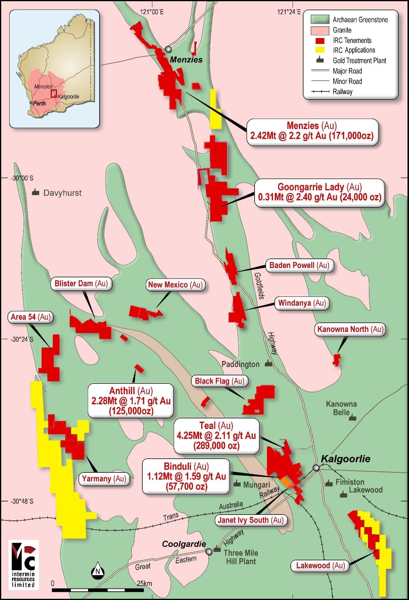 The Menzies project area is located 100km north of Kalgoorlie Boulder (see Figures 1 and 3 in link below) and was recently returned to Intermin on a 100% basis as announced to the ASX on 7 February 2019. The current Mineral Resource Estimate for Menzies stands at 2.42Mt at 2.20g/t Au for 171,310 ounces at a 1g/t Au lower cut-off grade.