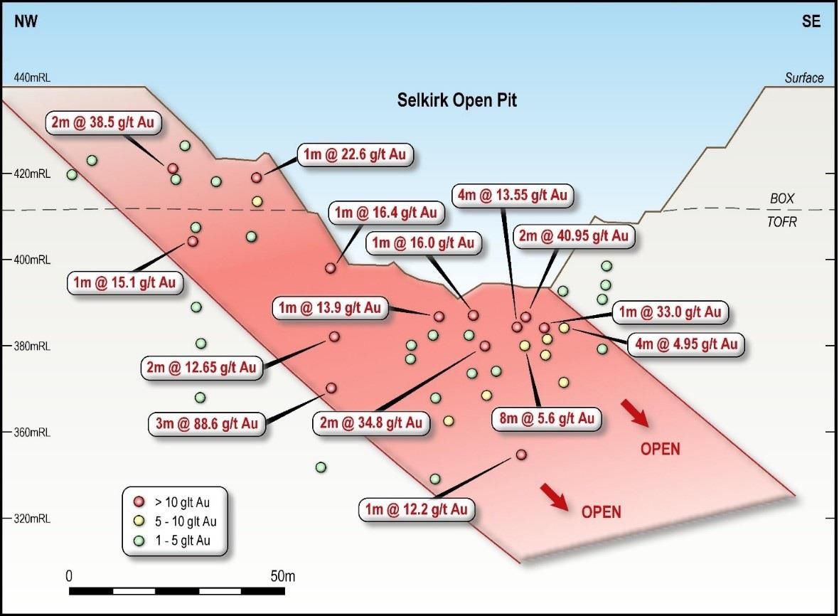 A small program will also be completed at the Selkirk prospect which was a small, historic high grade underground mine producing 5,000t @ 24.0 g/t Au for 3,858oz. Open cut mining in the 1990's produced 42,000t @ 4.60 g/t Au for 10,070oz. Recent work by Intermin in 2015-2016 identified encouraging high grade potential beneath the pit with intercepts including 3m @ 88.62 g/t Au from 84m, 1m @ 15.10 g/t Au from 40m and 1m @ 16.41g/t Au from 50m. The Selkirk mineralisation is still regarded as being open at depth (see Figure 4 in link below).