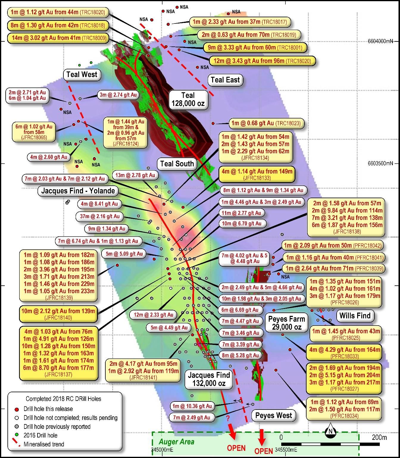 - At Teal, follow up drilling to the east of the completed Teal open pit testing extensions to recent results including 14m at 3.02g/t Au from 41m and 12m at 3.43g/t Au from 96m