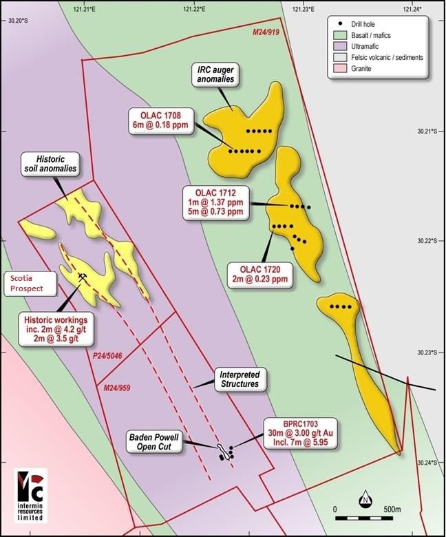 The Scotia prospect is 66km North of Kalgoorlie and 2km NNW of Intermin's Baden Powell project area (see Figures 1 and 8 in link below). Similar to Baden Powell, the gold mineralisation appears to be related to a porphyry-ultramafic contact. Several historic workings in the area have been tested with better results including 2m @ 4.42 g/t Au from 30m and 2m @ 3.5 g/t Au. Anomalous soils to the west of the workings were also tested by Metaliko in 2015 with an encouraging 1m @ 3.15 g/t Au from 20m being recorded. These drill holes have not been confirmed or followed up. Six RC holes are planned.