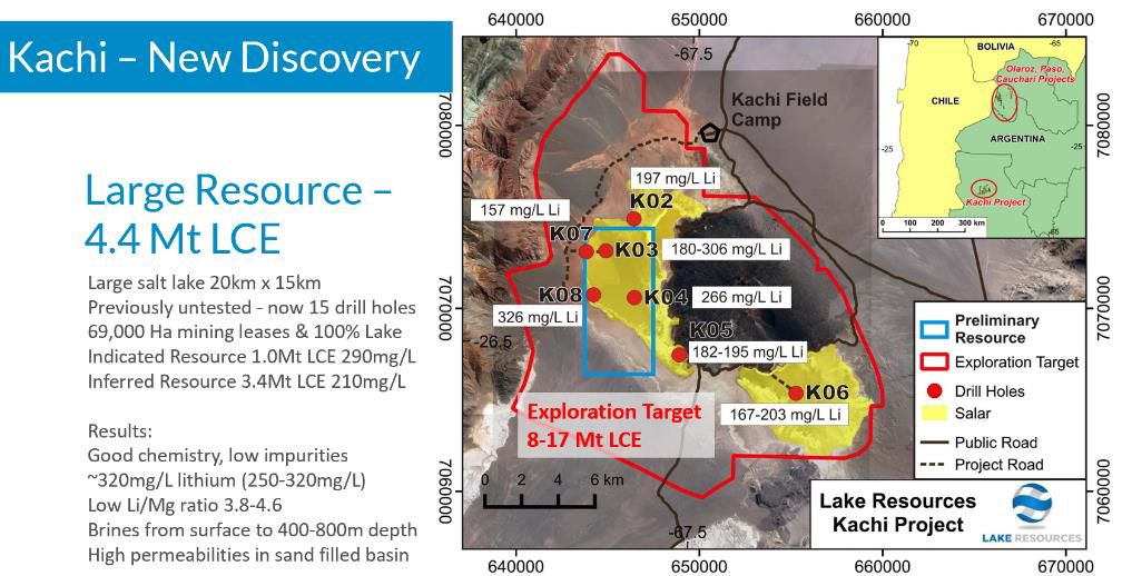 The Kachi project has an Indicated and Inferred Resource of 4.4 Mt LCE (Indicated 1.0Mt and Inferred 3.4Mt) within a much larger Exploration Target (refer ASX release 27 November 2018), covering some 69,000 hectares over almost an entire lithium-bearing salt lake in Catamarca Province.