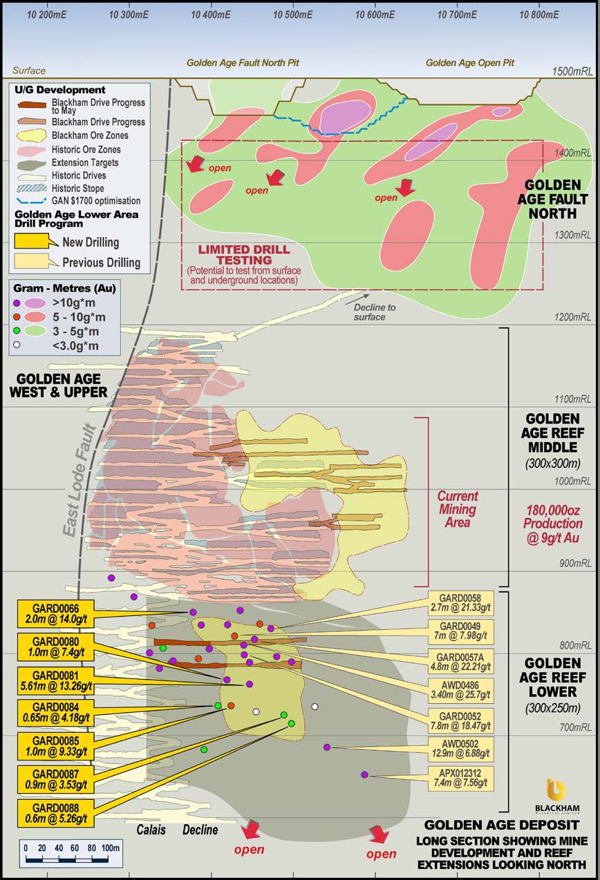 Blackham's strategy for GAL is to expand the resource and mining rate substantially above historical production of approximately 700-1,000 ounces per month. Recent underground core drilling was aimed at extending the Golden Age Lower (GAL) mineralisation down dip and down plunge. Best intercepts included: