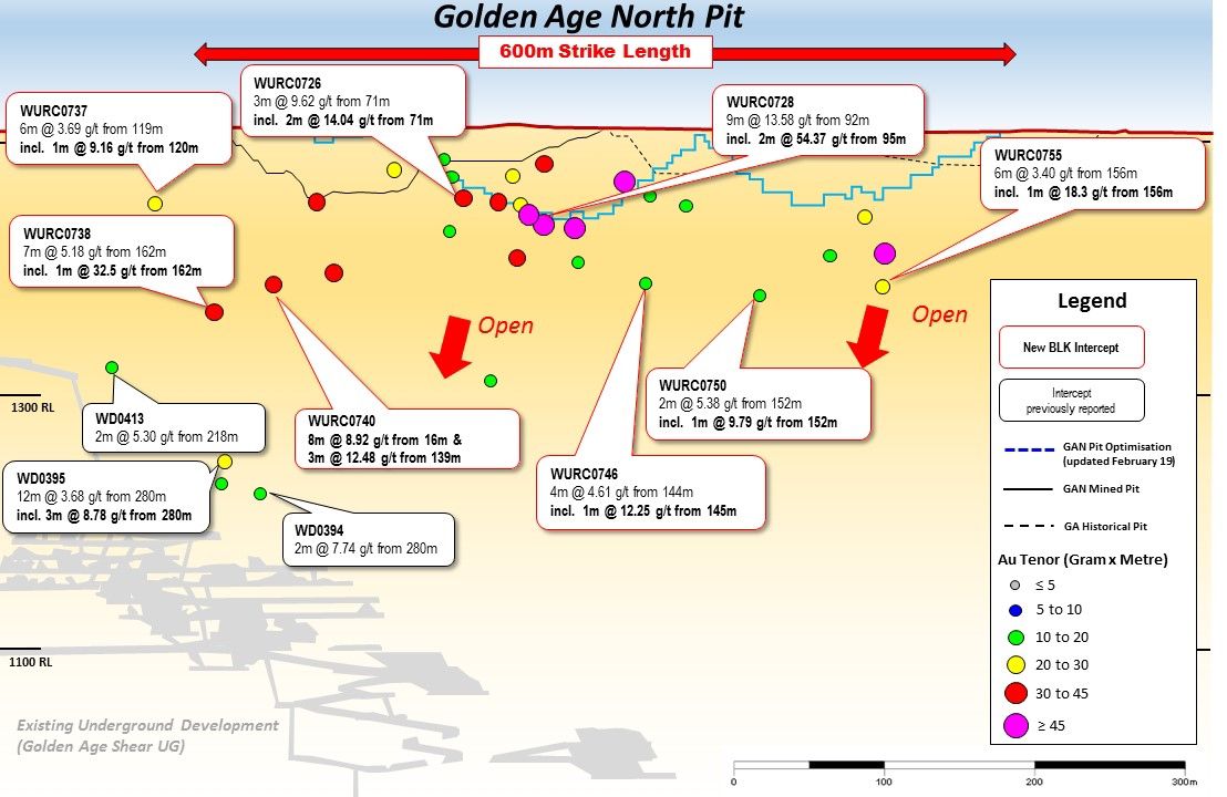- New drilling at Golden Age North (GAN) shows excellent grades below the current pit, including: