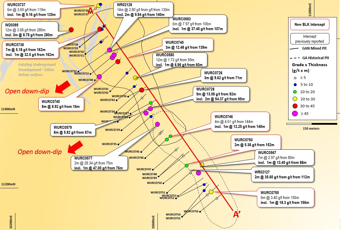 Grade control drilling towards the base of the GAN pit also returned excellent grade zones with greater than 20 gram-metre intercepts, further reinforcing the mining potential below the GAN pit. These results support the potential for a new shallow underground mining front to complement the existing operation and introduce greater economies of scale.