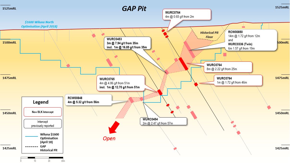 The latest drilling has also been successful in identifying the free milling cross cutting quartz reef structures (WURC0764 and WURC765). A review of the existing resource model is in progress and subject to positive mining studies, a Gap Pit cut-back will be included in the mining schedule in the second half of 2019.