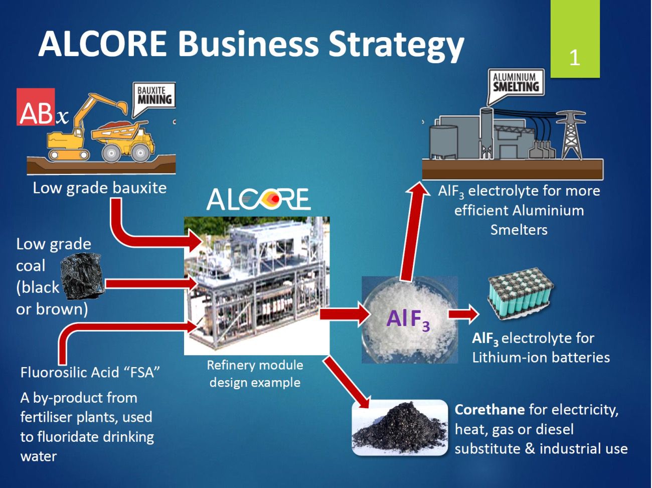 - ALCORE's patent (pending) application technology is designed to refine raw bauxite to produce Aluminium Fluoride (AlF3) and valuable co-products. AlF3 is an essential electrolyte ingredient in aluminium smelters