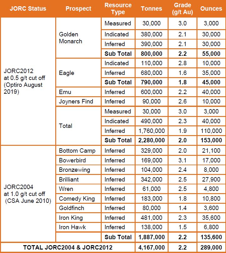 Golden Monarch currently has a JORC 2012 Mineral Resource Estimate of 800,000 tonnes at 2.2 g/t Au for 55,000 oz (refer to GWR ASX announcement 15th August, 2019 and Table 1 in link below).