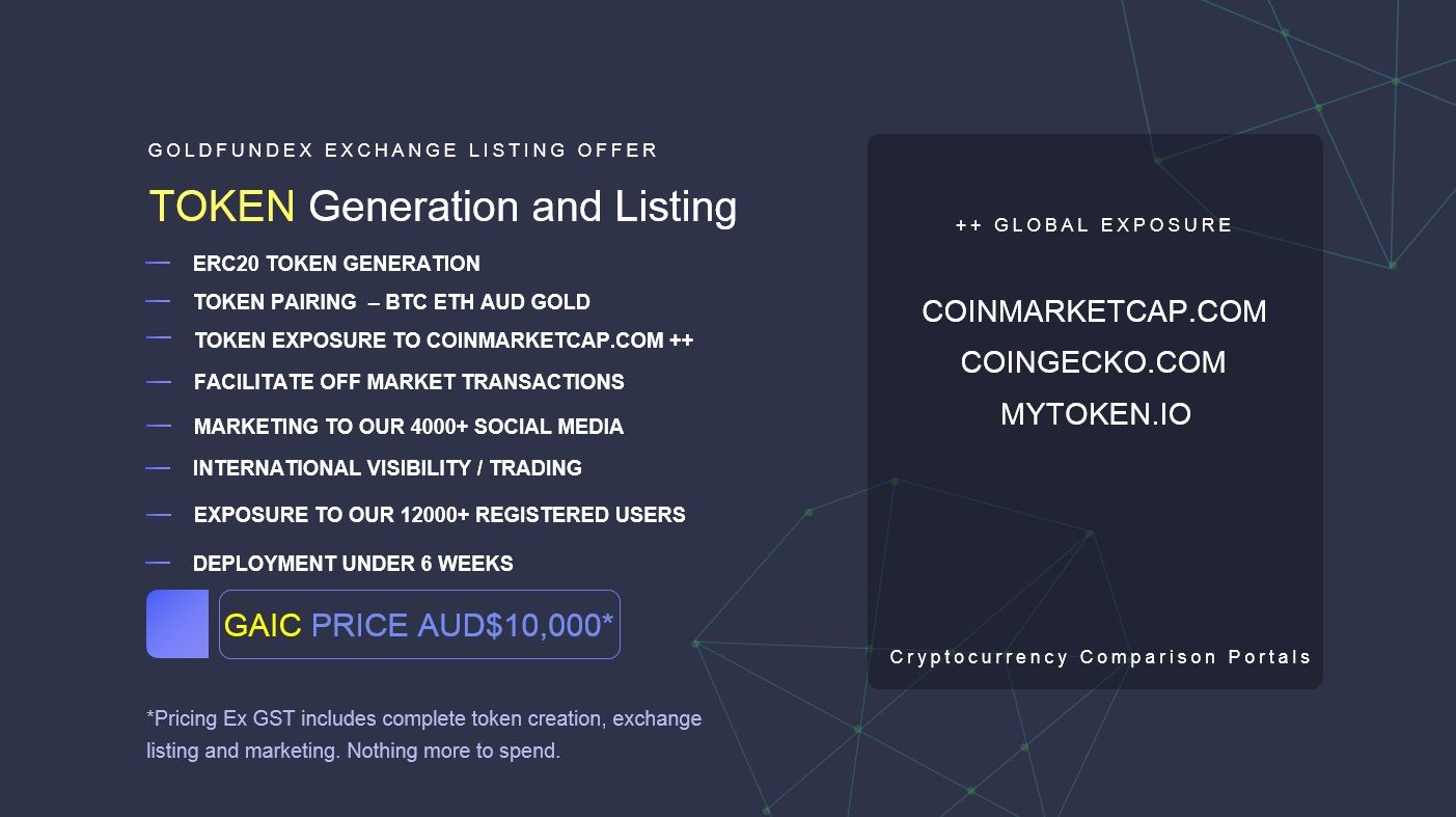 The GoldFund exchange is offering a platform for new entrants in the cryptocurrency market, including the creation of the ERC 20 compliant tokens, listing on the exchange, and promotion to their existing userbase of over 12,000 members. GoldFund is recognised internationally on major cryptocurrency information platforms such as www.coinmarketcap.com